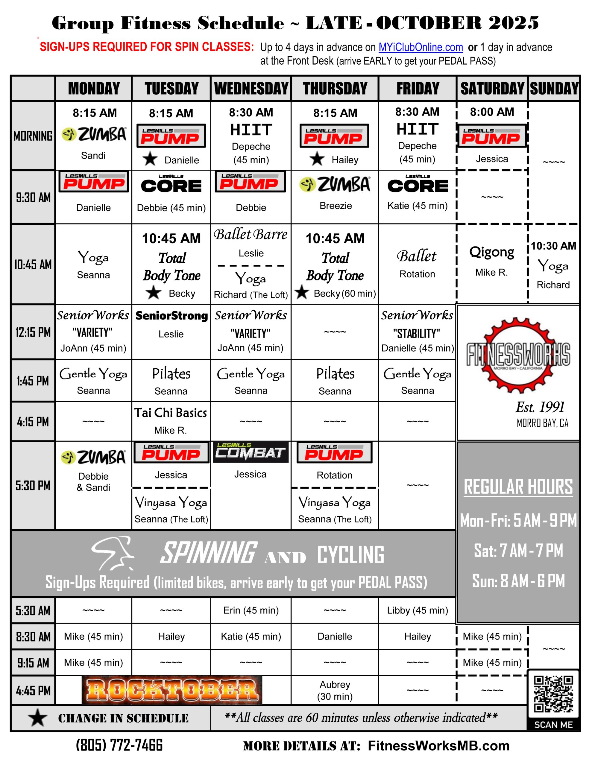 SIGN-UPS required for Spin classes. Please cancel if you can’t make it to class. Online sign-ups = up to 4 days in advance OR at the Front Desk = 1 day in advance. Please COME EARLY and check in with the Front Desk Staff to pick up your Spin Pedal Pass. Your spot will be given to the waitlist at 5 minutes before class starts.